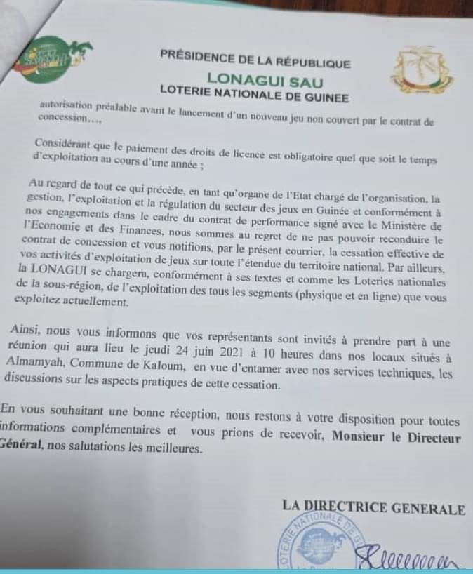 La LONAGUI S.A.U a notifié à GUINEE GAMES la cessation effective de toutes ses activités d’exploitation de jeux sur toute I ‘étendue du territoire national. La Loterie nationale de Guinée n’a pas renouvelé le contrat arrivé à expiration, parce qu’elle reproche, entre autres faits, à la société appartenant à Antonio Souaré- en tout cas jusqu’à recemment-, un manque de transparence dans la déclaration des chiffres d’affaires. Selon nos informations, la société doit près de 200 milliards de GNF à l’Etat guinéen.