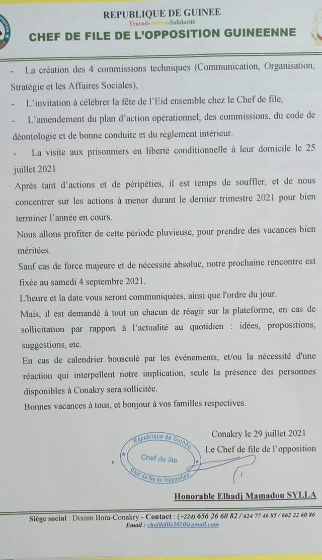 « Après tant d’actions et de péripéties, il est temps de souffler, et de nous concentrer sur les actions à mener durant le dernier trimestre 2021 pour bien terminer l’année en cours. Nous allons profiter de cette période pluvieuse, pour prendre des vacances bien méritées. Saut cas de force majeure et de nécessité absolue, notre prochaine rencontre estfixée au samedi 4 septembre 2021. L’heure et la date vous seront communiquées, ainsi que l’ordre du jour. Mais, il est demandé à tout un chacun de réagir sur la plateforme, en cas de sollicitation par rapport à l’actualité au quotidien : idées, propositions, suggestions », dit la note qui stipule aussi qu’ « en cas de calendrier bousculé par les événements, et/ou la nécessité d’une réaction qui interpellent notre implication, seule la présence des personnes disponibles à Conakry sera sollicitée ».