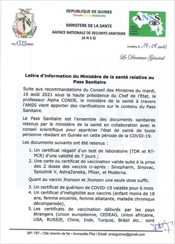 Dans cette lettre, il est précisé que ” le Pass Sanitaire est l’ensemble des documents sanitaires retenus par le ministère de la santé en collaboration avec le conseil scientifique pour apprécier l’État de santé de toute personne résidant en Guinée en cette période de Covid-19″.