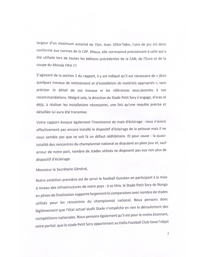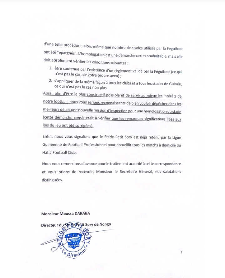 CONAKRY- Dans un courrier adressé à la Fédération Guinéenne de Football, la direction du stade Petit Sory de Nongo conteste les conclusions du rapport des inspecteurs dépêches par la Féguifoot. Dans ledit rapport, la fédération n’a pas homologué le stade Petit Sory, sous prétexte qu’il y aurait encore des travaux restant à faire, et qui ne répondent pas aux normes internationales