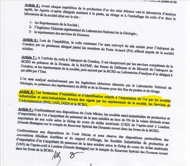 Détail important, l’arrêté conjoint exige que les bordereaux d’expédition et d’identification relatifs à l’exportation de l’or par les sociétés industrielles et semi-industrielles doivent être « signés par les représentants de la société, les services de l’administration (BNE, LNG, DGD) et la BCRG ».