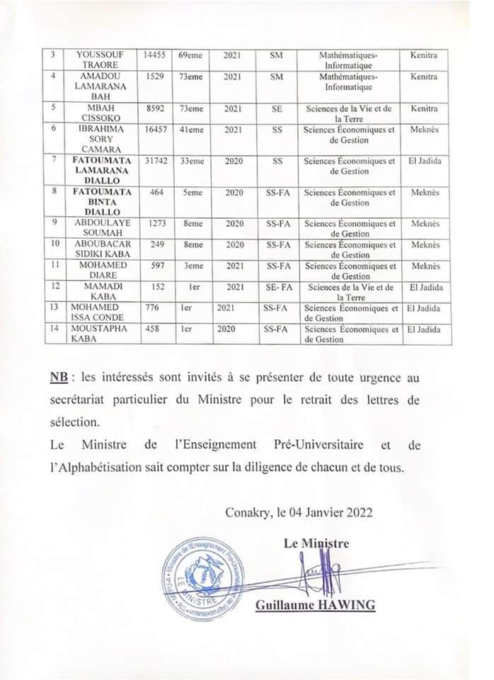 Une injustice réparée. Des boursiers (Franco-arabe et Enseignement général) sessions 2020 et 2021 au nombre de 14 peuvent enfin sourire. Ils iront finalement au Royaume du Maroc pour y poursuivre leurs études universitaires. Le ministre de l’Education nationale et de l’Alphabétisation Guillaume Hawing l’a annoncé mardi dans un communiqué