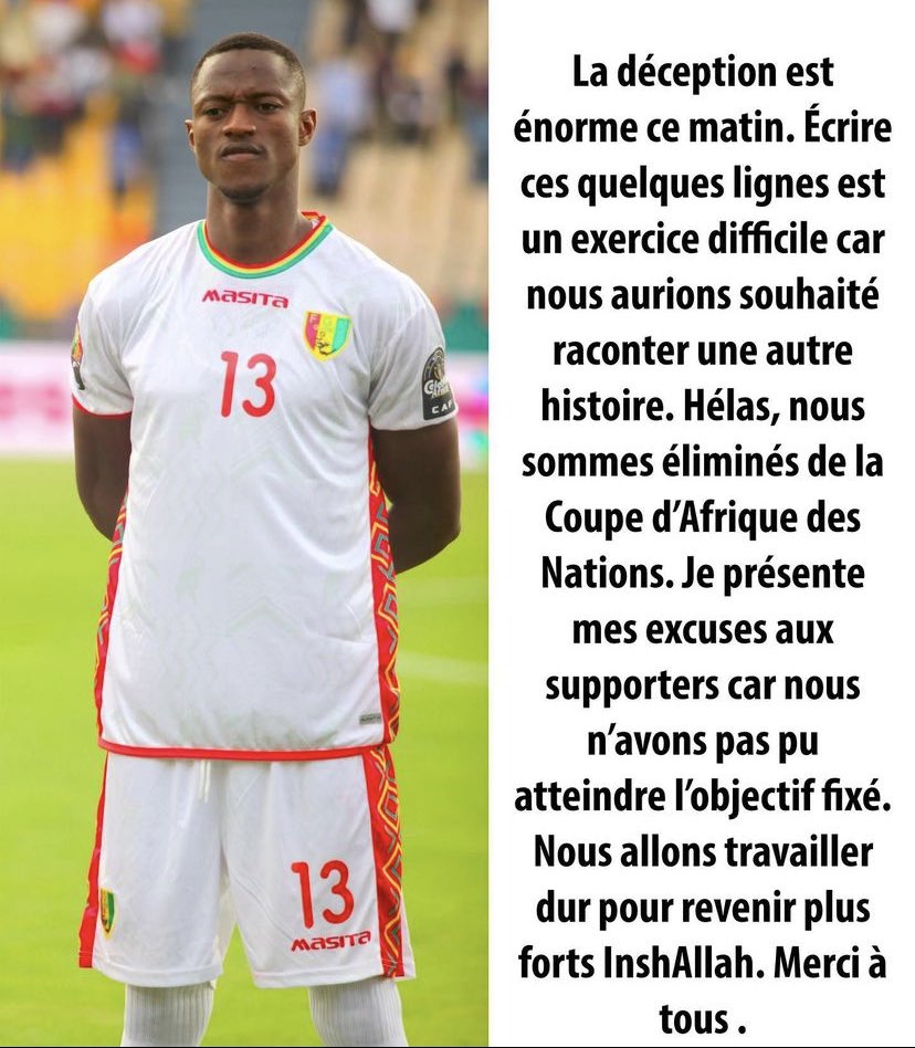 BAFOUSSAM- La CAN de la Guinée a pris fin ce lundi 24 janvier contre l’équipe de Gambie en huitièmes de finale au Cameroun. Le Syli se projette désormais sur la coupe d’Afrique des nations 2023 en Côte d’Ivoire. Après cette triste élimination de la Guinée, certains joueurs ont posté des réactions sur leurs différentes pages.