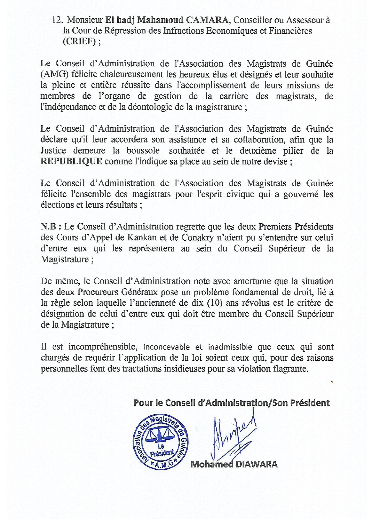 Dans un communiqué dont copie a été transmise à Mediaguinee, le Conseil d’Administration (CA) de l’Association des Magistrats de Guinée (AMG) -présidé désormais par le juge Mohamed Diawara- met en garde contre toute violation des lois qui régissent le Conseil Supérieur de la Magistrature (CSM)…