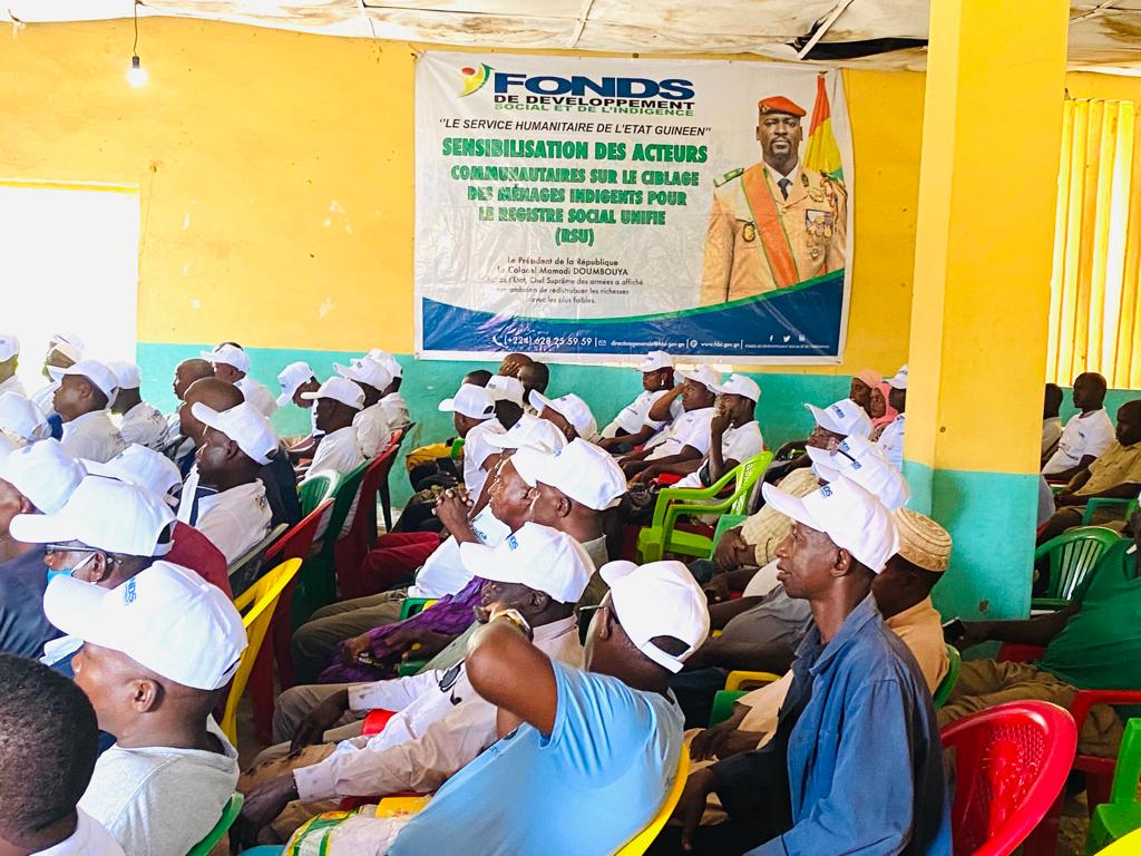 « J’ai l’honneur de vous adresser ce discours, en ce jour solennel consacré au lancement des travaux de sensibilisation communautaire sur le ciblage des ménages indigents dans la région de Boké. Permettez-moi de remercier sincèrement tous les acteurs communautaires de la préfecture de Koundara qui ont bien voulu répondre à cet appel. Cette région est caractérisée par l’exploitation des ressources minières dans ses différentes préfectures. L’homme a toujours eu des besoins illimités alors que les ressources pour les satisfaire sont limitées. La réconciliation de ces deux préoccupations constitue une préoccupation majeure du Président de la République, Chef de l’Etat, Chef suprême des Armées, le colonel Mamadi DOUMBOUYA, qui est vivement attaché au respect des droits humains, la transparence dans le secteur d’exploitation des ressources minérales, la protection des droits des communautés vivant dans les zones minières. La mise en place du registre social unifié (RSU) permettra une répartition adéquate des ressources générées par les entreprises minières et autres entre les filles et fils du pays sur la base des données fiables. Autrement, cela rendra visibles l’apport et le rôle des compagnies extractives à l’augmentation de la croissance économique, la lutte efficace contre la pauvreté, l’assistance aux personnes vulnérables et le développement social dans notre pays. Il faut rappeler que, depuis la prise du pouvoir par le Comité National du Rassemblement pour le Développement (CNRD), le développement communautaire est centré sur le renforcement des communautés et leur bien-être, et cela nécessite un engagement sans précédent du gouvernement. Cependant, la tendance actuelle consiste à revenir vers un équilibre permettant aux sociétés de soutenir les communautés dans la gestion de leur propre développement par le biais des données du Registre Social Unifié (RSU) », a déclaré Lansana Diawara. Et de poursuivre : « C’est pourquoi, je suis convaincu que ce projet de Registre Social Unifié (RSU) sera une opportunité pour la population de la région administrative de Boké afin d’être dans une plateforme de prospection, des ménages pauvres et indigents. Ce processus sera également un cadre de protection ciblée des droits humains et environnementaux des communautés. Le Registre Social Unifié (RSU) constituera la seule porte d’entrée des différents acteurs de protection sociale. En accordant au maximum une (1) heure de temps à nos agents enquêteurs qui seront déployés dans un laps de temps, les ménages et leurs membres auront la chance de bénéficier de cette opportunité que l’Etat guinéen veut bien accorder à tous et sans exception. C’est raison pour laquelle, je vous invite donc à accompagner le Fonds de Développement Social et de l’Indigence (FDSI) dans ces opérations de ciblage pour la mise en place du Registre Social Unifié (RSU), en transmettant les mêmes messages de sensibilisation à vos communautés respectives. Toutefois, votre rôle ne se limite pas qu’à cela, les agents enquêteurs vont bientôt être déployés sur le terrain ; ils auront besoin de votre accompagnement. Nous pouvons compter sur vous pour la réussite de ce programme afin que tous les Guinéens jouissent des fruits de la croissance économique du pays. Pour votre information, dans la région de Boké, le Fonds de Développement Social et de l’Indigence (FDSI) envisage de cibler 874 613 personnes pour être enregistrées dans la base de données du Registre Social Unifié (RSU), soit 124 945 ménages. C’est l’objectif à atteindre pour qu’à la fin, vous et nous, soyons félicités. Cependant, d’après les données de l’INS, la Préfecture de Koundara compte environ 9 sous-préfectures et 60 quartiers/ districts. Les messages de sensibilisation doivent pourtant parvenir dans toutes ces agglomérations. Avec cet espoir et la certitude de résultats probants, j’ose croire que cette campagne de sensibilisation communautaire sera à la hauteur de toutes les attentes. Enfin, Je ne pourrais terminer mon intervention sans vous réitérer l’engagement personnel et ainsi que celui de ma Direction en vue de relever et surmonter ensemble les défis qui entravent la protection sociale dans notre pays ».