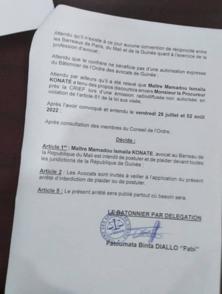 . Cette décision est inique. Elle ne protège pas et vole au secours d’un Parquet spécial pour satisfaire le pouvoir, bannir l’avocat. J’ai saisi les Ordres dont je dépends et j’attends !#Avocats #Guinée #Défense — Mamadou Ismaila KONATE (@vieuxmko) August 5, 2022