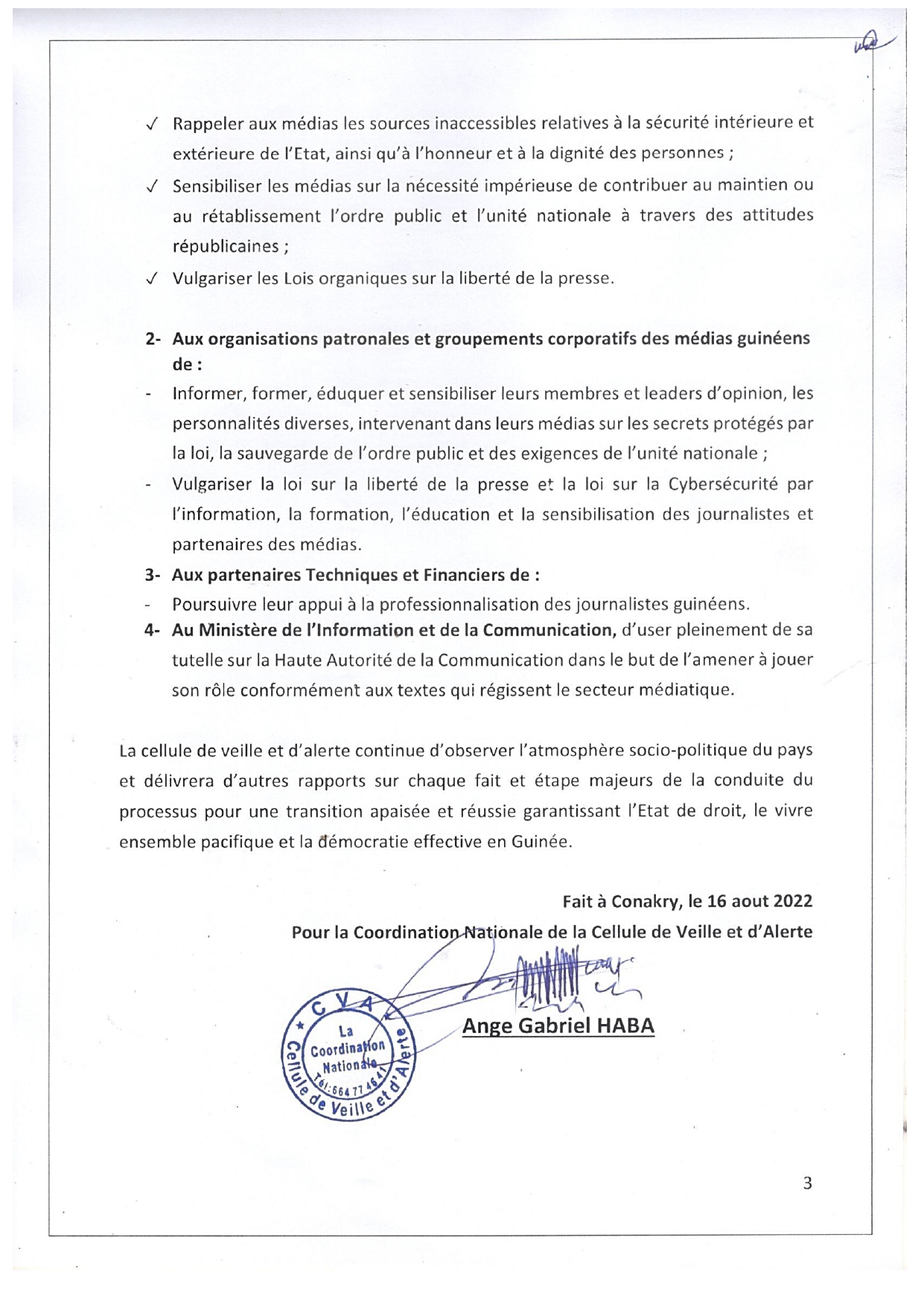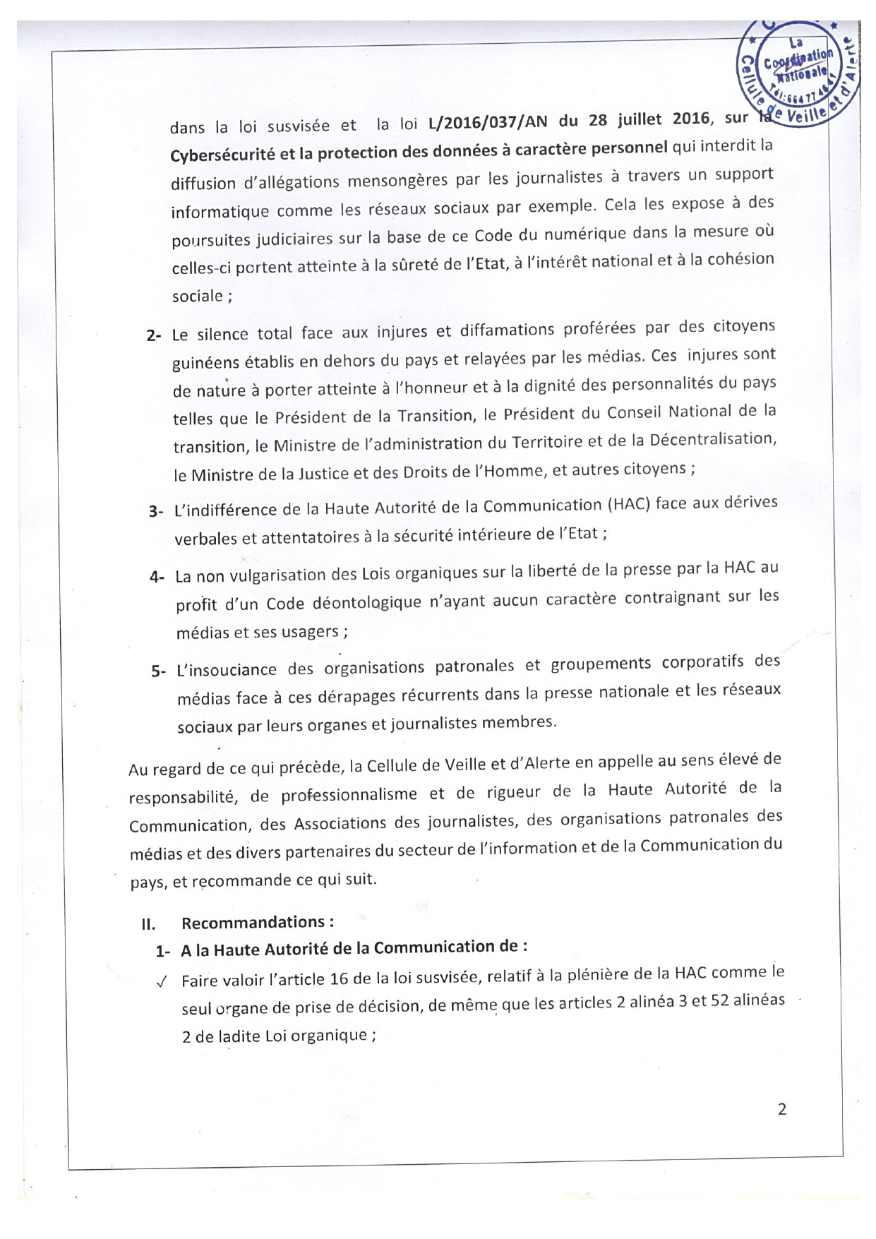 Au vu de ce qui précède, la cellule de veille et d’alerte a soumis quelques recommandations à la Haute Autorité de la Communication, aux organisations patronales et groupements corporatifs des médias guinéens, aux partenaires Techniques et Financiers et au Ministère de l’Information et de la Communication, afin que chacun dans son rôle puisse œuvrer pour une transition apaisée et réussie garantissant l’Etat de droit, le vivre ensemble pacifique et la démocratie effective en Guinée.