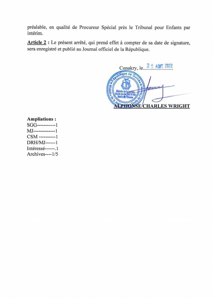 Article 82 du statut des Magistrats : « En l’espèce, avec deux (2) Substituts, la suspension du Monsieur Mohamed Diawara est loin de susciter une insuffisance de Magistrats au parquet spécial près le Tribunal pour enfants de Conakry ».