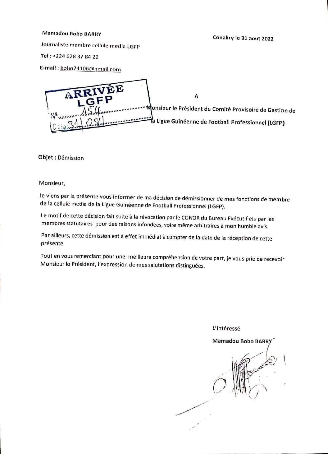 Jusque-là membres de la cellule médias de cette instance chargée d’organiser les championnats guinéens de football de Ligue 1 et Ligue 2, Aliou Chérif et Mamadou Bobo Barry viennent d’annoncer leur départ de l’équipe. Ces deux journalistes sportifs guinéens justifient leur décision par le fait de la révocation de la Ligue-pro par le CONOR pour disent-ils, des raisons infondées voire même arbitraire à leurs avis. Ils ont déjà envoyé des emails ci-dessous au président du comité provisoire, Lucien Guilao.