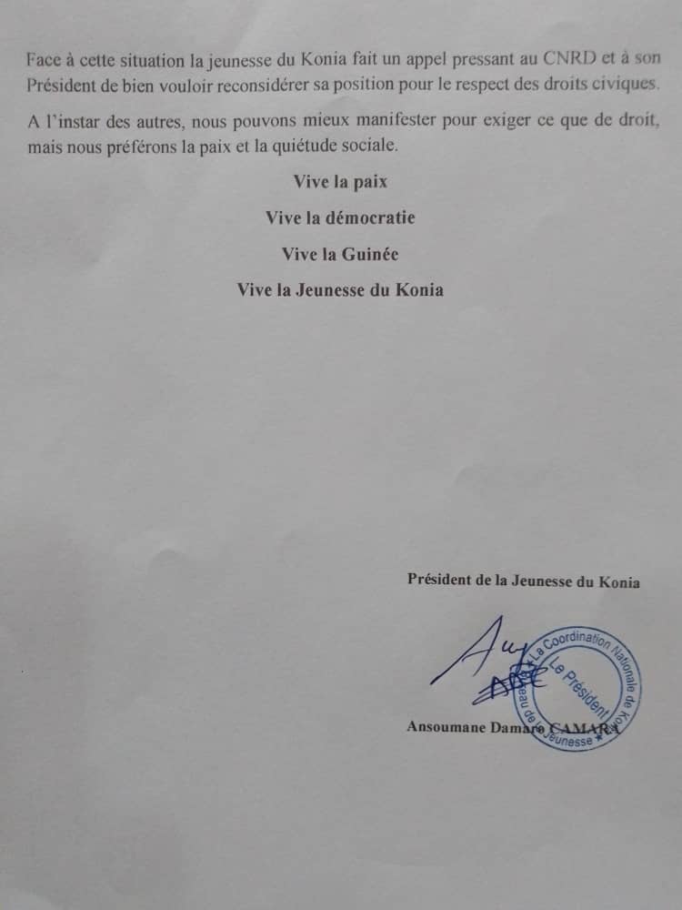 Ci-dessous, ladite déclaration signée du président de la jeunesse du Konia