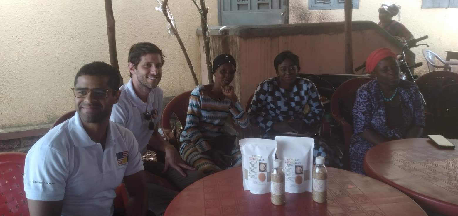 Après ces échanges qui furent assez fructueux, la délégation est partie dans le marché Pépé-Kalé, situé en pleine ville, pour rencontrer la présidente de l’Union des femmes agrobusiness qui évoluent dans la chaîne de valeur de transformation des produits locaux à leur siège. Là, il était question de remercier l’ambassade des États-Unis.