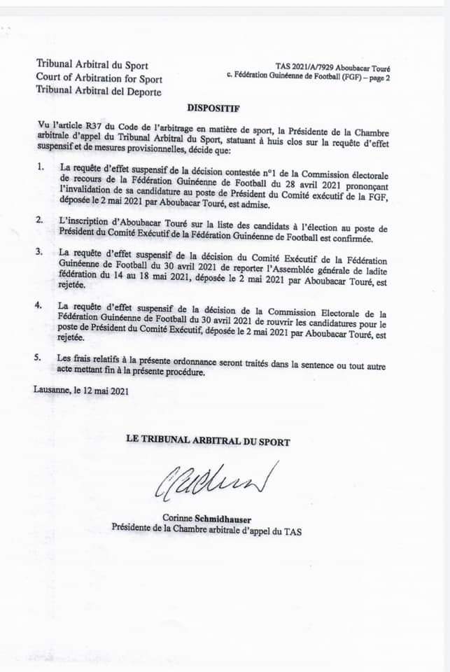 Dans une ordonnance, le Tribunal arbitral du Sport (TAS) a confirrmé l’inscription du nom d’Aboubacar Touré “Bouba Tri” sur la liste des candidats au poste de Président. Il a également validé la réouverture de l’appel à candidatures par la Commission électorale pour le poste de Président et confirme la date du 18 mai 2021 pour la tenue de l’Assemblée générale élective de la Fédération Guinéenne de Football. Ordonnance…