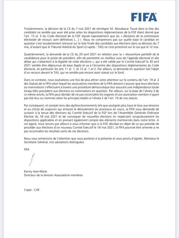 C’est officiel. La Fifa dans un courrier adressé lundi au Secrétaire général de la Fédération guinéenne de football (FGF*Féguifoot) demande de surseoir aux élections du Comité exécutif (COMEX) de la FGFde ce mardi, 18 mai. Courrier…