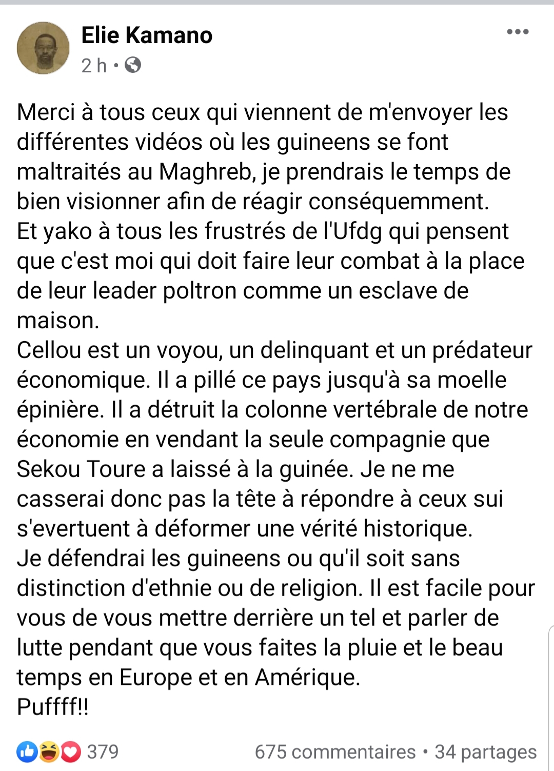 L’article Elie Kamako brûle Dalein sur sa page : “il a pillé le pays jusqu’à la moelle épinière” est apparu en premier sur Mediaguinee.org.